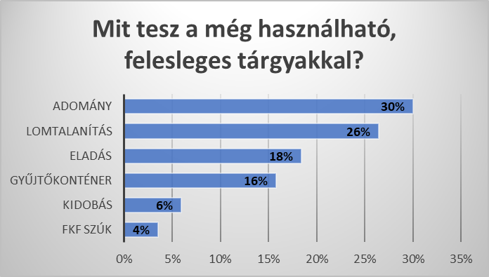 Megkérdeztük, mi lesz a sorsa a megunt, elhasznált, de még használható tárgyaknak. A válaszok közt az adományozás (30%) vezet, utána a lomtalanítást (26%) választják a háztartások. Az eladás a válaszok 18%-át tette ki, ruhagyűjtőkonténert, könyvszekrényt 16%-ban választanak a válaszadók. Az FKF Szemléletformáló és Újrahasznosító Központjába csak az esetek 4%-ában kerülnek a tárgyak, még a kidobás (6%) is megelőzi.