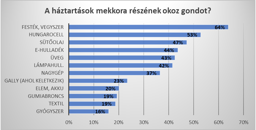 A hulladék kezelése általában is nyűgös feladatot jelent a legtöbb háztartásban, különösen akkor, ha az olyan külön gyűjtendő fajtákról van szó, amelyeket nem a háztól szállít el a szolgáltató. A kutatásban részt vevők nagy többsége számára a veszélyes hulladéknak minősülő vegyszer- és festékmaradékok, ezek csomagolása jelent problémát (64%), ezt követi a hungarocell (53%) és a használt sütőolaj (47%). Éppen csak lemaradt a dobogóról az e-hulladék és az üveghulladék.