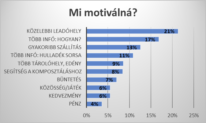 Mi segítené elő a szelektív gyűjtés hatékonyságát? Az otthonhoz közelebbi leadóhely és a kukák, konténerek gyakoribb elszállítása mellett a pontos, hiteles információ az, amivel még több hasznosítható hulladék juthatna vissza az anyagok körforgásába. A kérdőívet kitöltők 17%-a részletes információt igényelne (mit, hová, hogyan lehet vinni?), 11%-ban pedig a hulladék újrahasznosításáról adott hiteles információ hatna ösztönzően.