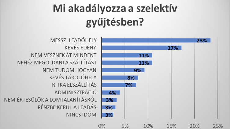 A szelektív gyűjtés sikere elsősorban azon múlik, mennyire könnyű elhelyezni a külön gyűjtött hulladékot: van-e a közelben hulladékudvar, sziget, van-e hely a szelektív kukában. Ezt erősíti meg a kérdőívben adott válaszok aránya: a hatékonyabb szelektálás akadályai közt a messzire eső leadóhely (23%), a kis kapacitású gyűjtőedényzet (17%), a szállítási és leadási nehézségek (11%) vezetnek. Csak kevesen említették, hogy az idő vagy a pénz akadályozná őket (3-3%).